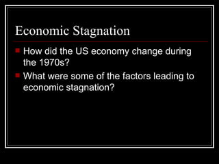 Sources of Stagnation After the flurry of economic growth in the 1950s and 1960s the US. One reason for the end of the postwar economic boom in the 1970s was. He served from 1969-1974.